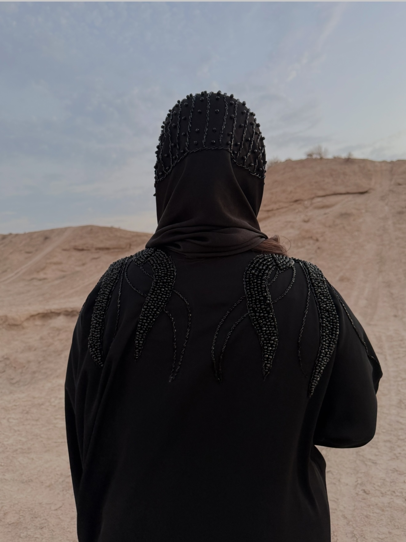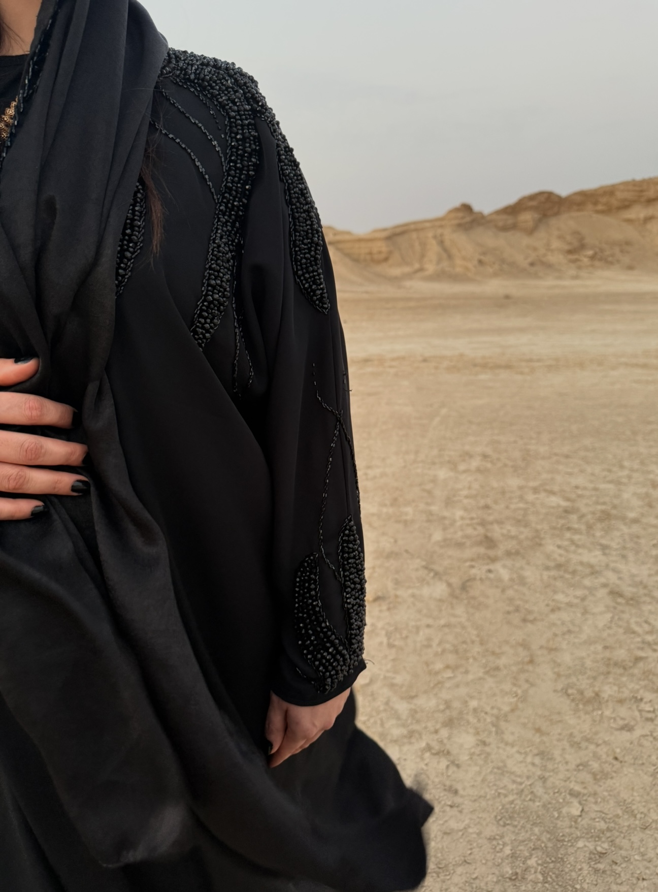 عبا ونوس با جواهر دوزی مشکی دونه به دونه با دست دوخت شده یه کار شیک و مجلسی و جلو کار دکمه غیبی خورده و با پارچه ندا کره